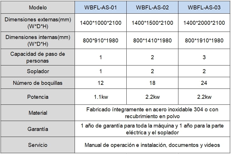 WBFL ofrece tres modelos estándar de ducha de aire personal